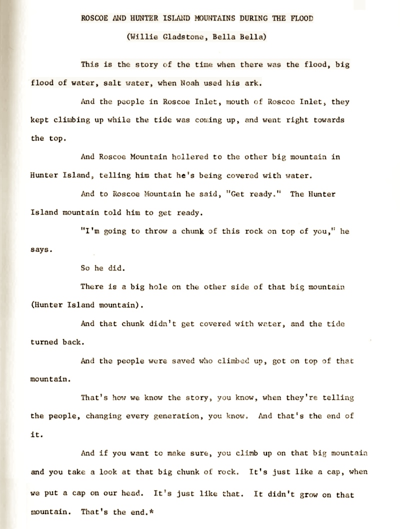 people flee to M̓ṇ́sgṃ́x̌ƛi during the rising waters. During the flood, M̓ṇ́sgṃ́x̌ƛi “took its own top and threw it over to Gwa’xkun [Roscoe Inlet] which thus became high enough so that the people could save themselves. The rocks hurled by EmE’nsgEmxLee [M̓ṇ́sgṃ́x̌ƛi] may still be seen as the top of Gwa’xkun which rises over a terrace.” (Boas 1932, as told by Andrew Wallace). Finally, the origin of the island Ya’laLeE [Goose Island] is connected to M̓ṇ́sgṃ́x̌ƛi through the eagle-ancestor who tied the island with a line to M̓ṇ́sgṃ́x̌ƛi to stop it from drifting. “A deep hole is at the place where the line was tied and the line itself may still be seen there.” (Boas 1932, told by Ai’wageɫ). More recently, and perhaps for millennia, M̓ṇ́sgṃ́x̌ƛi was a navigational guide for fishermen and a weather mountain.
